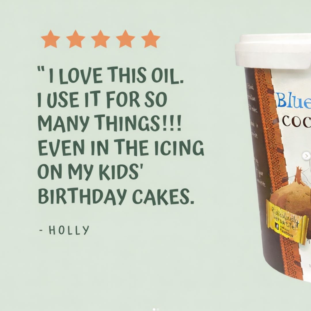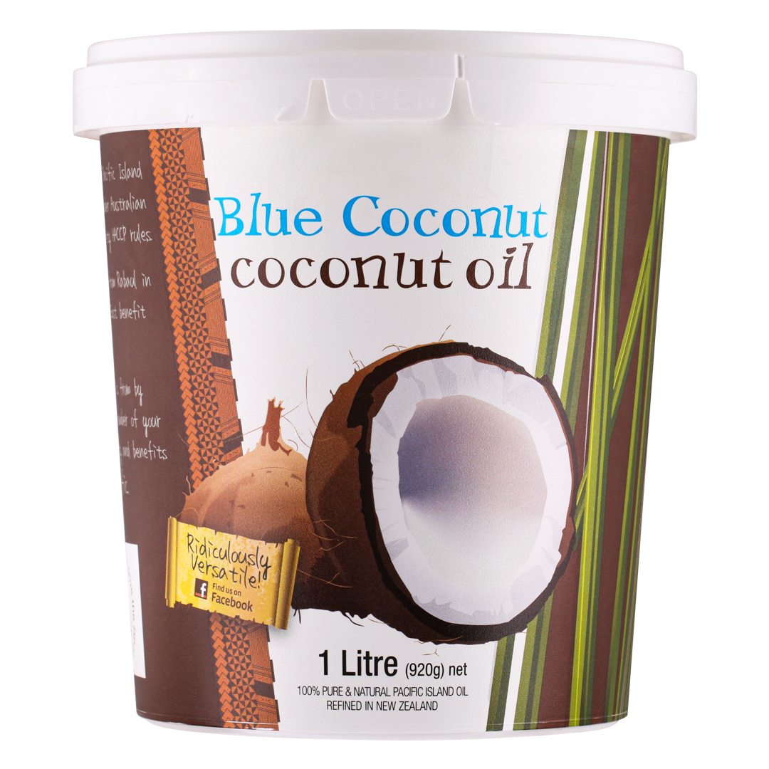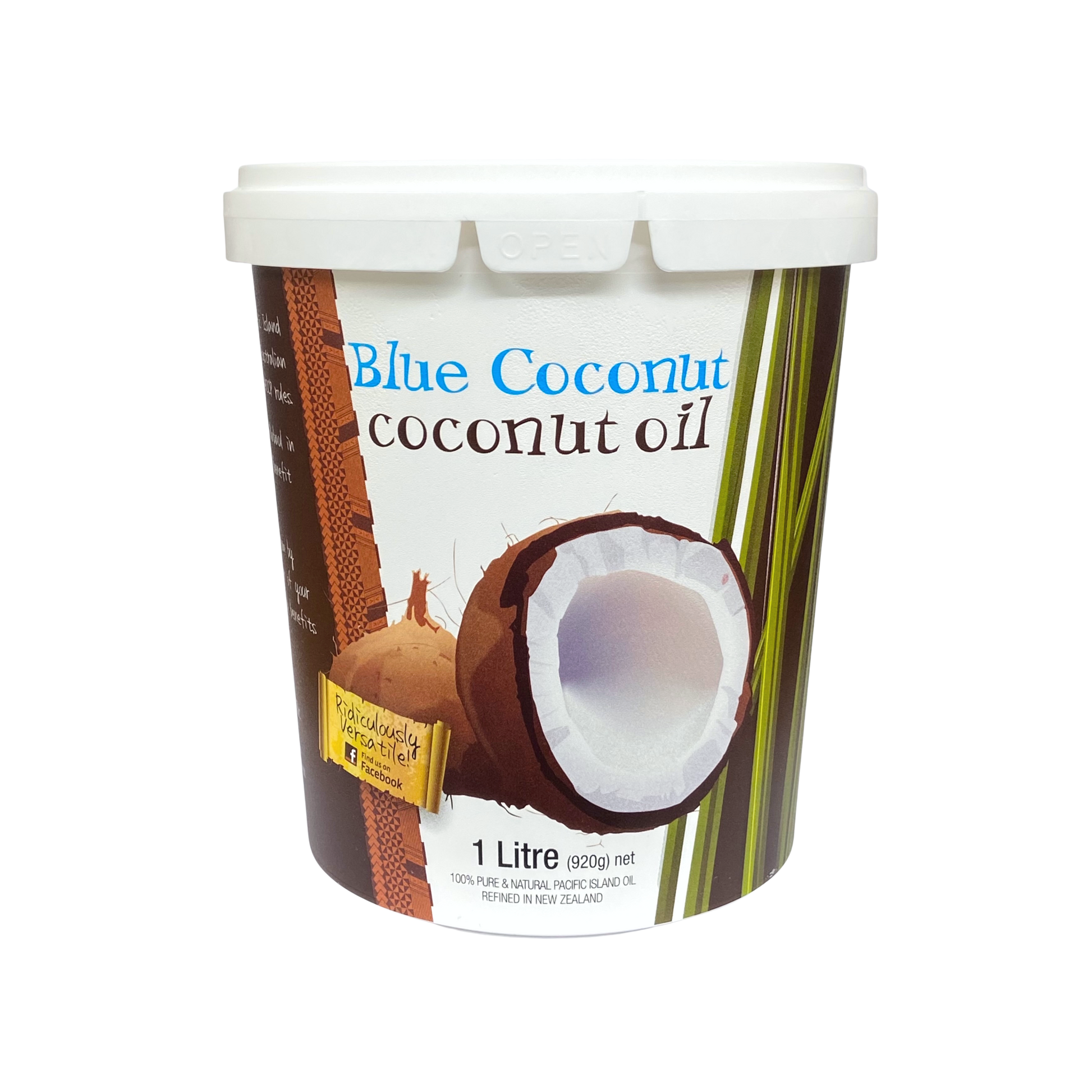 1 Litre Coconut Oil - Blue Coconut cooking oil is 100% Pure & Natural Pacific Island coconut oil refined in New Zealand. Unlike virgin coconut oil, refined coconut oil has no coconut taste or aroma. For those who do not like the taste or smell of coconut, refined oil is better across all baking & cooking as it is tasteless and odourless. Use exactly the same as your other cooking oil. Ridiculously Versatile!